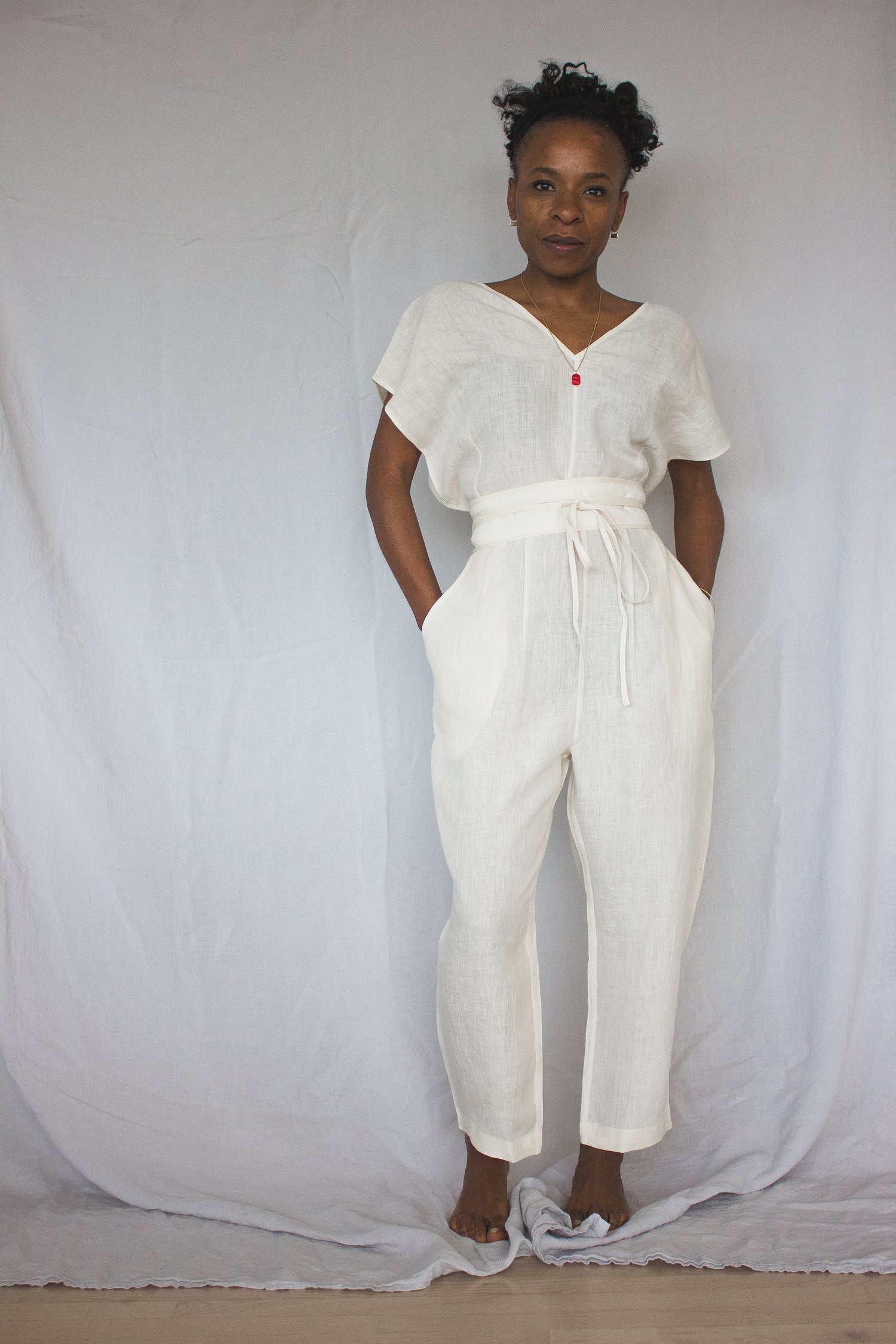The Ada Jumpsuit is made from artisanal hand-loomed linen crafted by artisan communities in the out skits of Kolkata, India and sewn by Citrus fashions, a family owned production house.